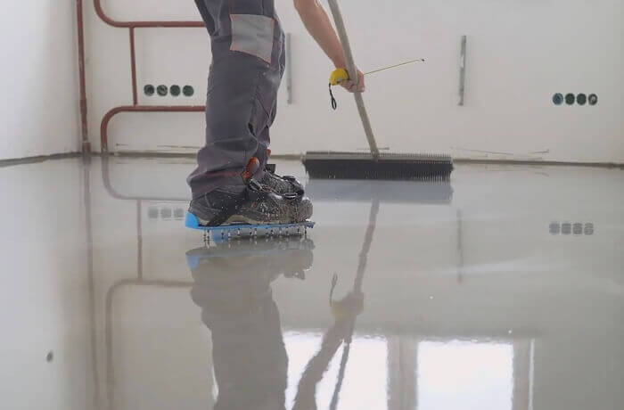 - Пол заливается за один заход, от дальней стены к выходу. Там, где есть стык "сухого" и "свежего" раствора, почти всегда остаётся заметная граница.