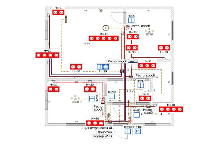 - План расположения оборудования. Чертеж с точной привязкой к стенам и комнатам. На нем отмечают, где именно будут установлены выключатели, распаечные коробки и щиты. Приводятся расстояния от углов, дверных проемов и потолка.